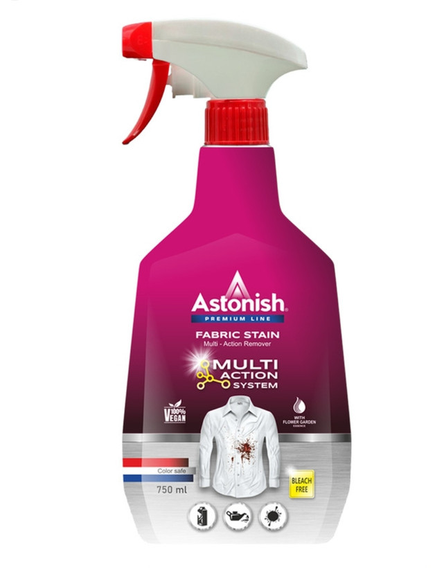 اسپری لکه بر لباس استونیش لکه بر انواع لکه های خون، روغنی ، نوشیدنی ، لوازم آرایشی ، چمن ، مواد غذایی و … بدون ترکیبات سفید کننده مناسب منسوجات سفید و رنگی – مناسب البسه می باشد. درصورتی که لک و کثیفی تازه ایجاد شده با یک دستمال نخی بصورت ضربه ای و چرخشی نم آن را بگیرید تا پخش نگردد. سپس مطابق دستورالعمل مربوطه عمل نمایید و روی دو طرف محل لکه اسپری کنید.