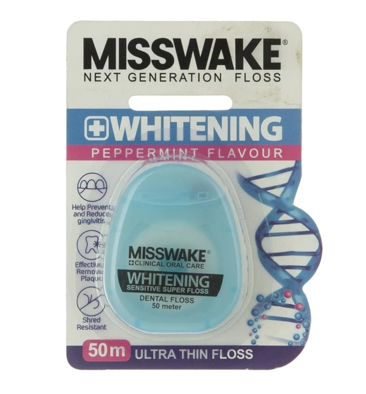 نخ دندان میسویک سفید کننده با طول۵۰ متر و حاوی موم زنبور عسل جهت پاکسازی کامل فضای بین دندانی است. نخ دندان وایتنینگ میسویک با از بین بردن باقی مانده غذا و خوراکی ها از میان دندان از ایجاد جرم و پوسیدگی دندان پیشگیری و در نهایت مانع از ایجاد پوسیدگی و بوی نامطبوع دهان می شود. این محصول با طعم نعنا فلفلی باعث ایجاد حس تازگی و طراوت دهان شده و به دلیل استفاده از موم طبیعی باعث ایجاد حساسیت و التهاب نمی شود.